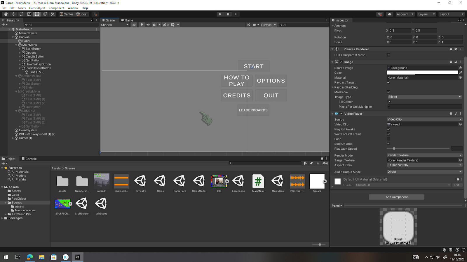 10/10/2023 - Finalized the code for the main menu. The code will load a page where you can select your difficulty, change your options, view credits and quit. UI was done simpily by adding buttons and text meshes and then by making a simple script attached to the menu to tell the buttons what to do like quit, start, options etc.
